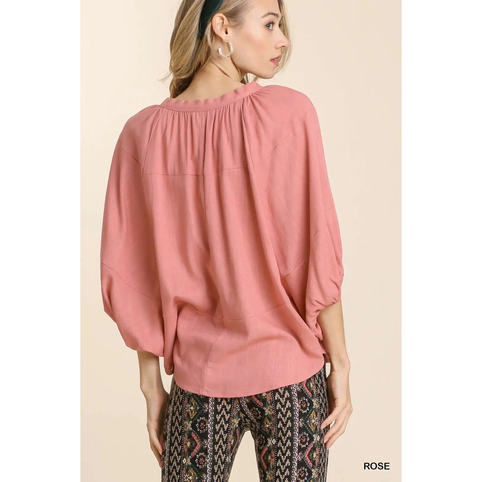 Umgee Rose Linen Blend Front Tie Top with Dolman Sleeves W/ Rounded Bottom