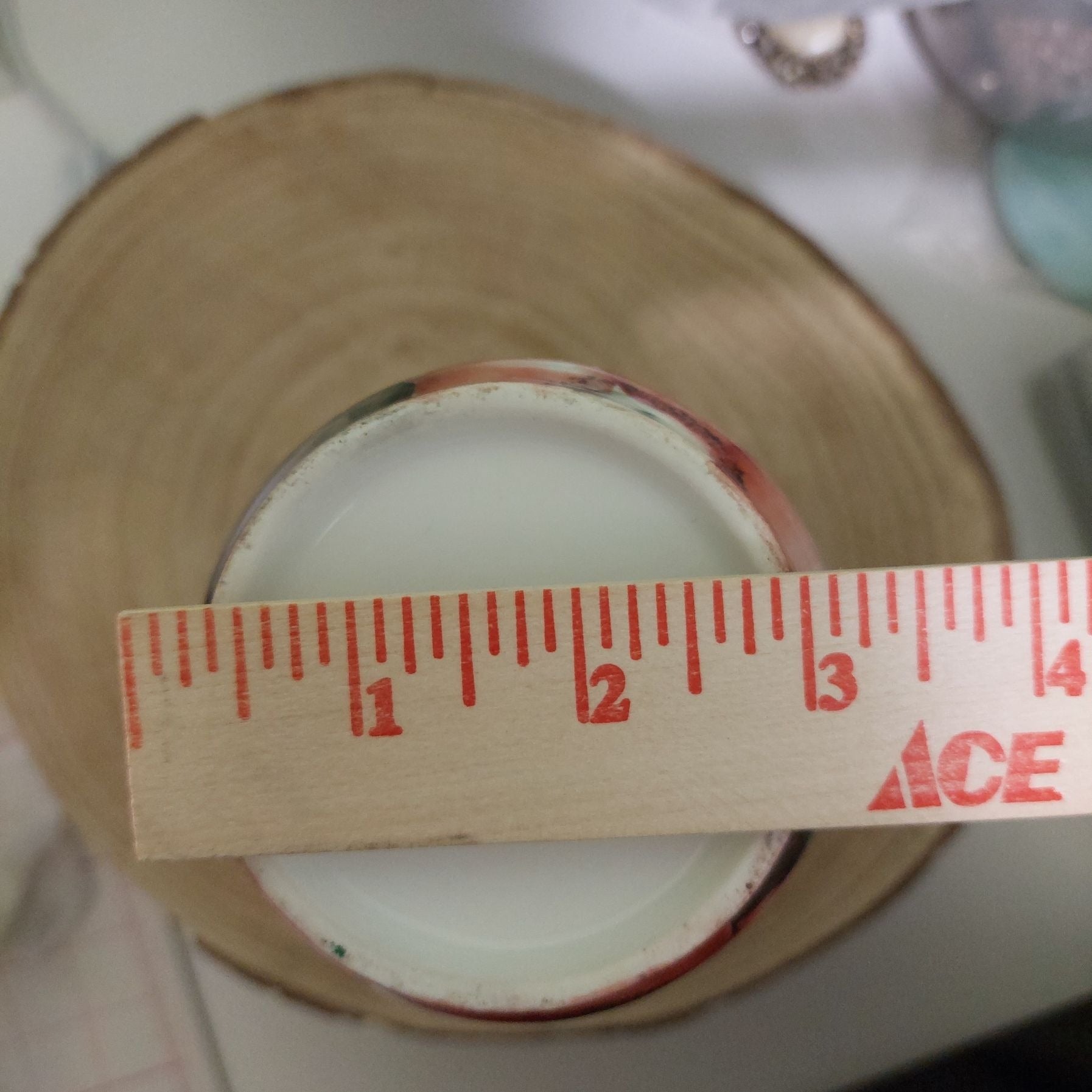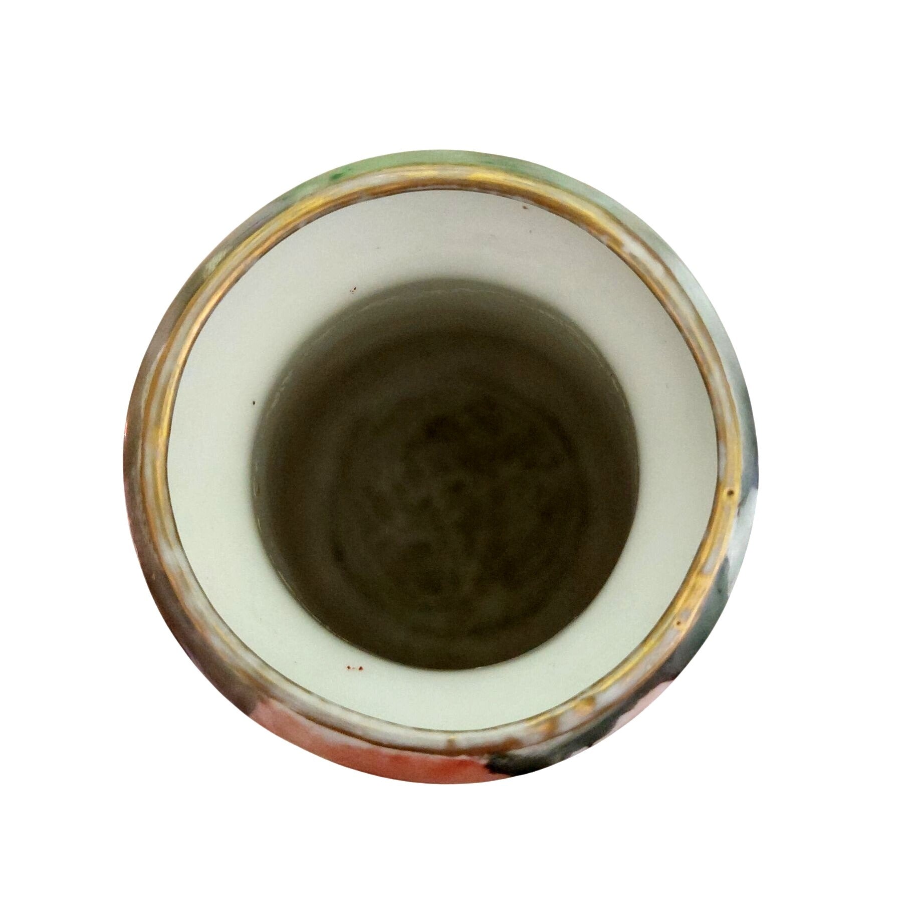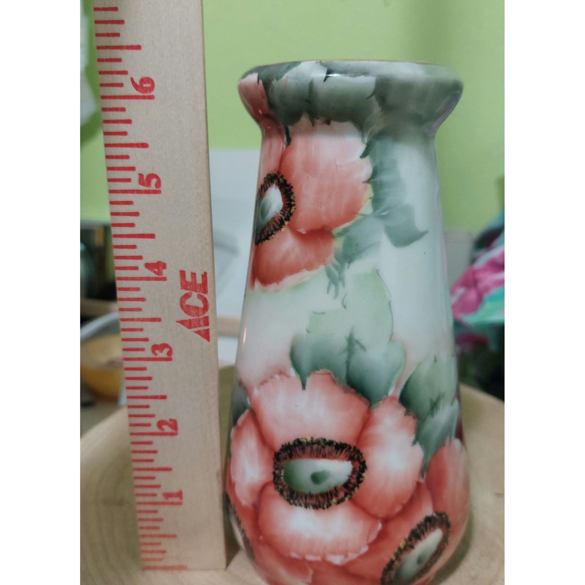 Light signs of wear consistent with age on rim. Measures 6" tall, base diameter = 3", opening diameter = 1.75".